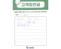 안녕하세요? 저는 타병원에서 좌측 전방십자인대 재건술과 내측 반월 상연 공판 봉합술을 하고, 10일간 7층 통합 병동에 입원하였습니다. 먼저 감사의 인사를 올리고 싶습니다. 입원 기간동안 으뜸병원에서 만난 모든 직원분들이 친절하고 따뜻하게 보살펴 주셔서, 힘겨웠던 입원 생활을 즐겁고 슬기롭게 잘 마무리할 수 있었습니다. ..