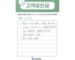 그동안 많이 발전되고 좋은 서비스에 또 한 번 감동받고 퇴원합니다. 모든 면에서 다 만족하고 특히 음식이 전보다 향상되었습니다. 여기서 많은 환자분들과 간호사, 조무사님들과 정이 많이 들었습니다. 또다시 올 일이 있다면 으뜸병원을 찾겠습니다. 많은 사람들한테 피알하고 김윤기 원장님한테 고마움을 전합니다.