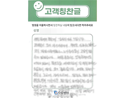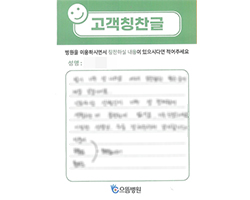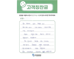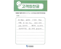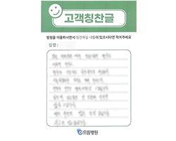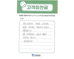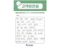 모든 직원분들께서 환자를 정성스럽게 대하여 주시고, 환자가 의도하는 하나하나를 세심하게 기록하였다가 조치를 취해 주시는 것이 환자를 우선으로 생각하는 병원이라는 것을 느꼈습니다. 입원해 있는 동안 잘 보살펴 주셔서 감사드립니다. 병원 추천은 많이 할 것 같습니다. 수고들 많으셨습니다.