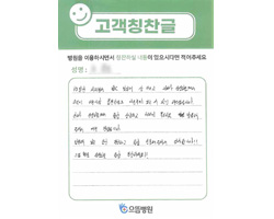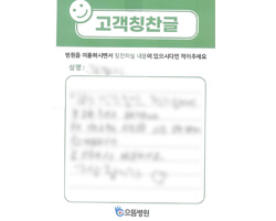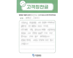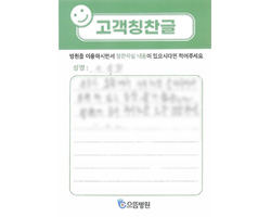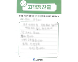 감사했습니다. 의사 선생님, 간호사 선생님의 친절 속에서 검사 잘 받고 갑니다. 나날이 으뜸병원의 발전이 있기를 바라며 2주 후 다시 뵙겠습니다. 수고하세요.