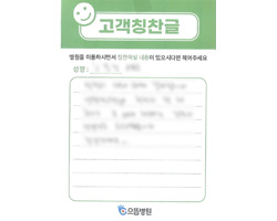간호사님 한분한분 너무 친절히 대해줘서 입원기간 너무 편안히 보내고 가네요. 지난 3년 전 신랑 회전근개 파열로 온 적 있어서 그때 친절한 감정을 느껴 다시 찾게 되고 소개도 많이 해주었답니다. 의료진 여러분 세심히 신경 써 줘서 많이 고맙습니다.
