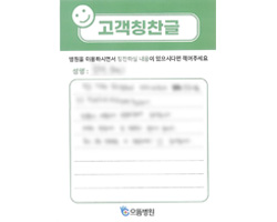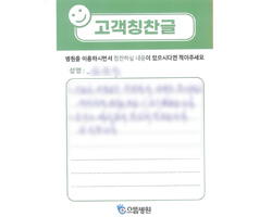 언제나 상냥한 목소리로 밝은 모습으로 지켜주시고 돌보아주심을 감사드립니다. 아프면 다시 꼭 이병원에서 받고 싶을 정도로^^ 수고 많이 하셨습니다.