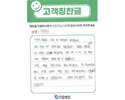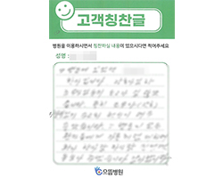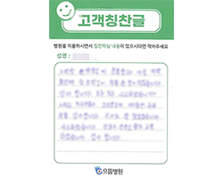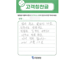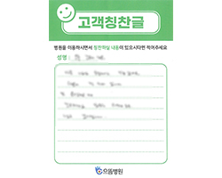간호사분들 너무 친절하십니다. 원장님이 좋으셔서인지 병원분들 모두가 좋으시고 간호조무사, 간병하시는 분들 다 정이 있으시고 좋으십니다. 병원에 있는 동안 너무 행복했습니다.