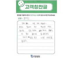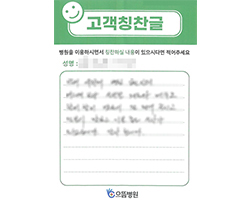 2주 입원해 있으면서 가족 같은 병원은 처음입니다. 대학병원, 소아과(산부인과) 입원해보았는데 으뜸병원이 쵝오!! 최고 입니당 ~ ♡ 앞으로 다칠 일이 많이 있을껀데 으뜸에만 올 것입니다. 신경 써주시는 게 눈에 보이고 친절해서 퇴원이 시원섭섭(?) 합니다~ㅋㅋ 보험 ,, 부분도 너무 감사하고 편하게 잘 있다가 갑..