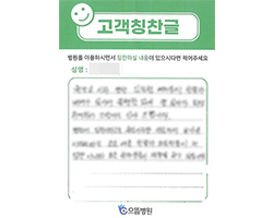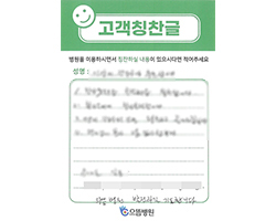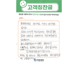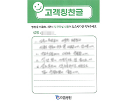 먼저 김윤기 원장님을 비롯한 모든 의료진에게 감사드립니다. 특히 최혜림 간호사님, 이상미 간호조무사님의 친절하던 보살핌 속에 건강하게 퇴원하게 된 것을 감사드리며 으뜸병원이 우리나라에서 제일 가는 병원이 되기를 바랍니다. 감사합니다.