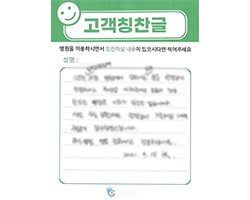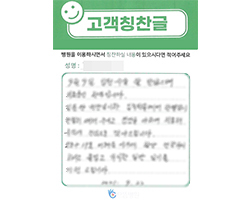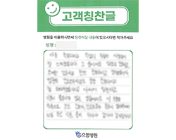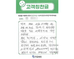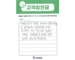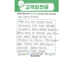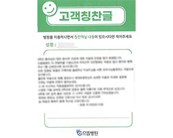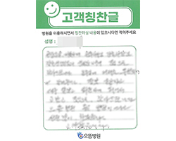 원장님 이하 병원 임직원 여러분의 친절과 배려가 있어서 불편 없이 잘 있다가 퇴원하게 되어 고맙다는 인사드립니다. 병원에 입원이라고는 처음이지만 지금까지 보아온 이미지와는 조금 다른 친절과 도움덕분에 저뿐만 아니라 모든 환자분들이 자랑을 하고 있습니다.