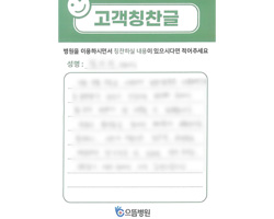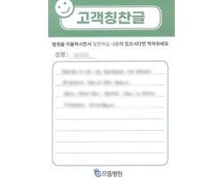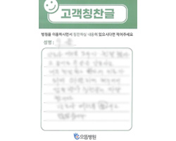 그동안 많이 발전되고 좋은 서비스에 또 한 번 감동받고 퇴원합니다. 모든 면에서 다 만족하고 특히 음식이 전보다 향상되었습니다. 여기서 많은 환자분들과 간호사, 조무사님들과 정이 많이 들었습니다. 또다시 올 일이 있다면 으뜸병원을 찾겠습니다. 많은 사람들한테 피알하고 김윤기 원장님한테 고마움을 전합니다.